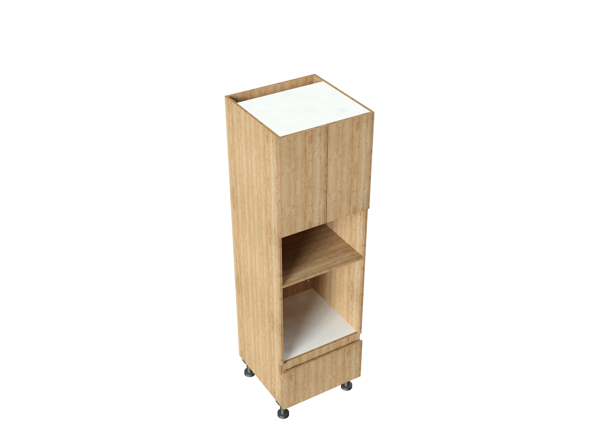 - The top shelf is for a microwave only, not an oven, due to the finger pull doors of the cupboard above